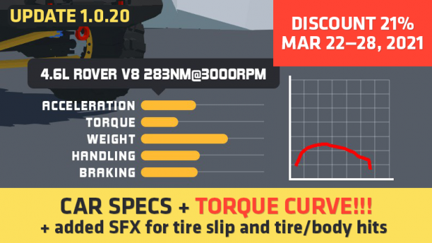 Added: car specs + torque curve, more power for crawler pickup and buggy, SFX for tire slip and tire/body hits, fixed some bugs.